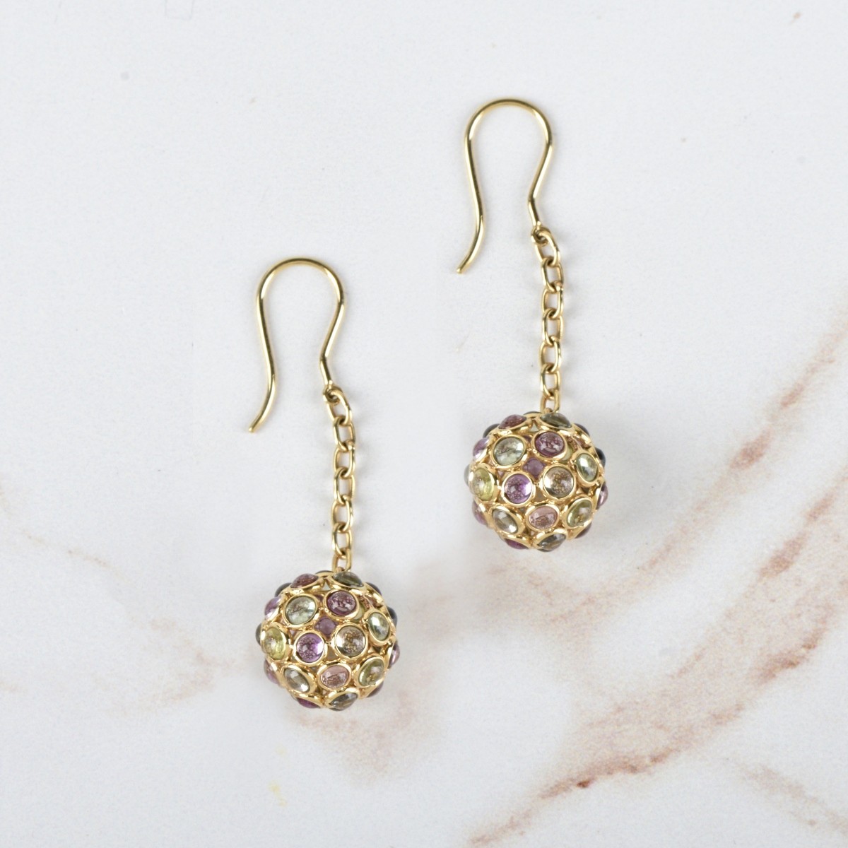Approx. 8.25 Carat TW Round Cabochon Multi-color Sapphire and 18 Karat Yellow Gold Dangle Ball Earrings. Sapphires with good color. Measure 1-5/8" L, 7/16" W. Approx. total weight: 5.03 grams. Condition: Very good condition. For additional information and/or WhatsApp video please contact our resident GIA Graduate Gemologist, Russ Kodner at 954.650.5030 Estimate: $650.00 - $1000.00 Domestic Shipping: $40.00