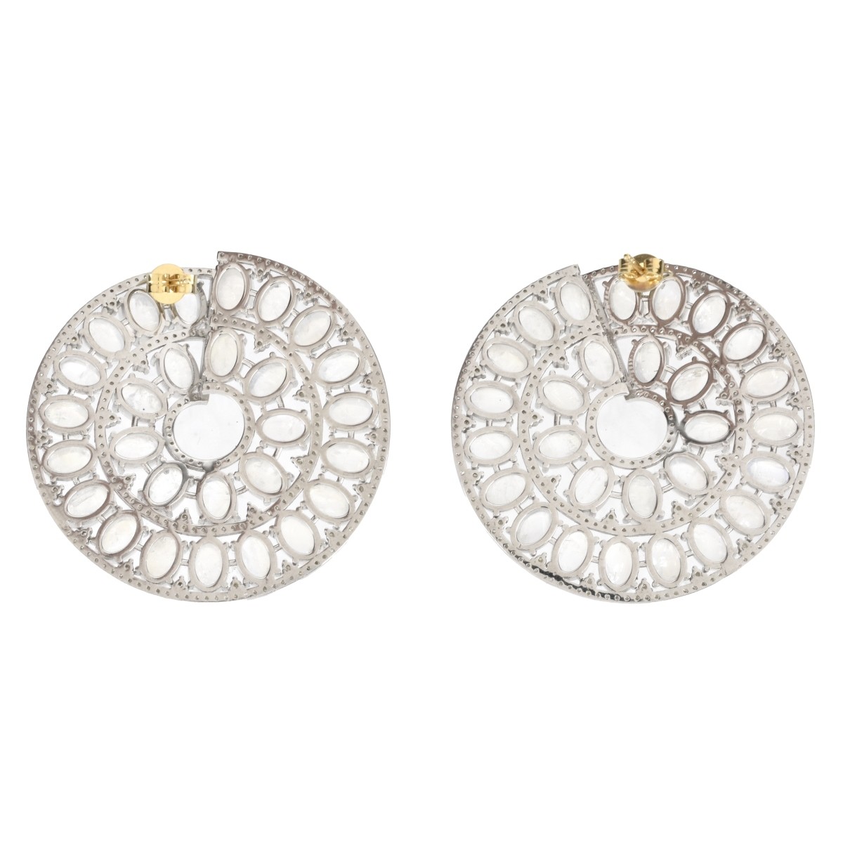 Large Approx. 53.0 Carat TW Oval Cabochon Rainbow Moonstone, 3.45 Carat TW Round Cut Diamond and Silver Earrings with 14 Karat Yellow Gold Posts and Post Backs. Moonstones with good play of color. Diamonds G-H color, VS-SI clarity. Measure 1-3/4" diam. Approx. total weight: 33.60 grams. Condition: Very good condition. For additional information and/or WhatsApp video please contact our resident GIA Graduate Gemologist, Russ Kodner at 954.650.5030 Estimate: $900.00 - $1200.00 Domestic Shipping: $40.00