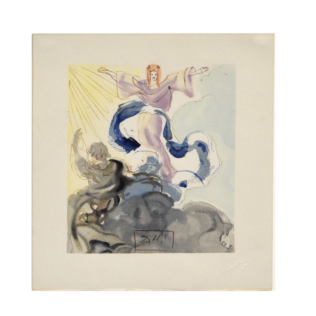 Salvador Dali, Spanish (1904 - 1989) Lithograph on Paper "The First Sphere" (Divine Comedy) Signed in the Plate. Watermark lower right. Sheet measures 13" x 10-1/4". Frame measures 25-1/4" x 22-5/8". Condition: Toning to the paper. Estimate: $200.00 - $400.00 Domestic Shipping: $145.00
