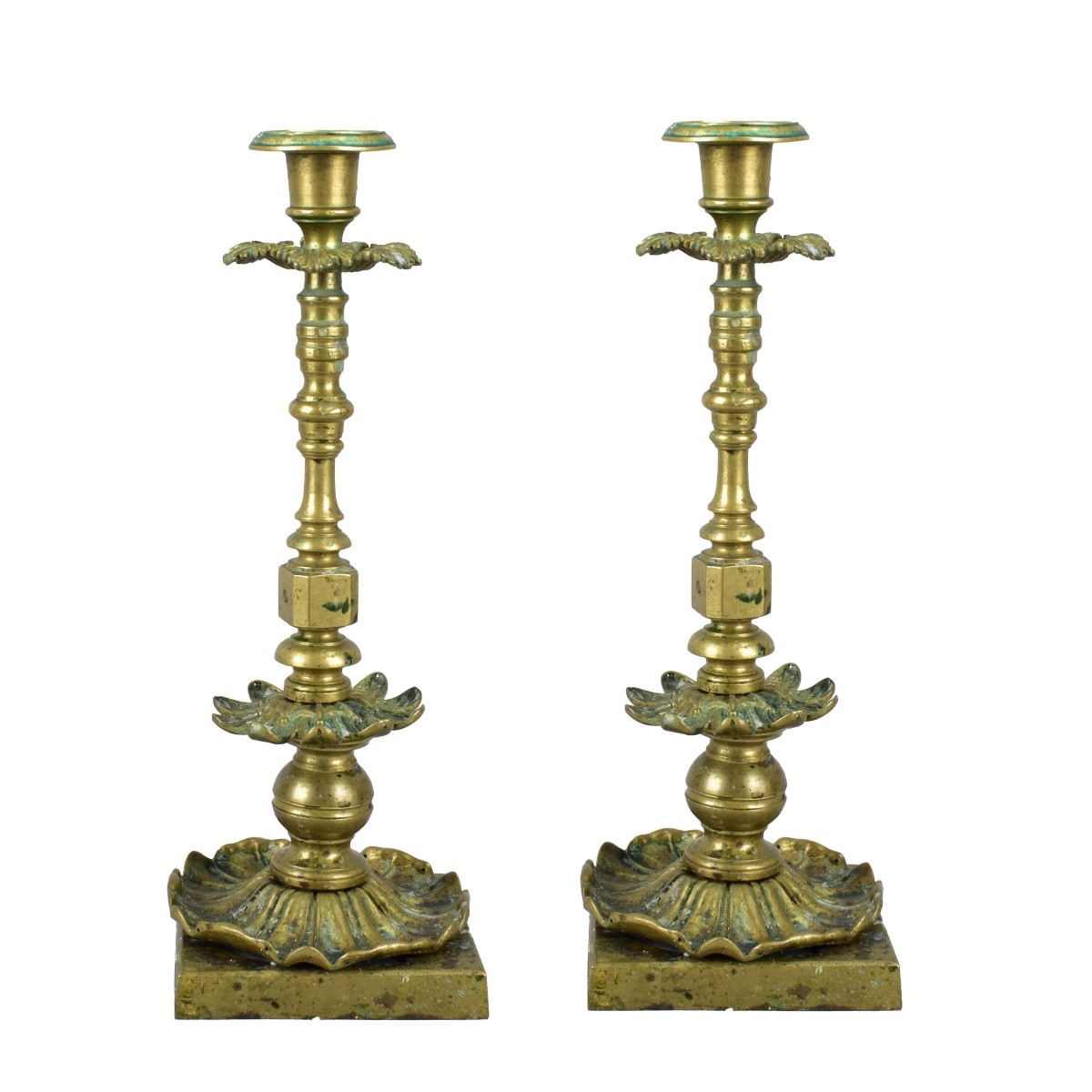 Pair Brass Candlesticks Leaf Motif. Measure 12-1/2"H x 4-1/2" Condition: Good Condition, needs to be cleaned. lots of wax. Estimate: $150.00 - $300.00 Domestic Shipping: $78.00