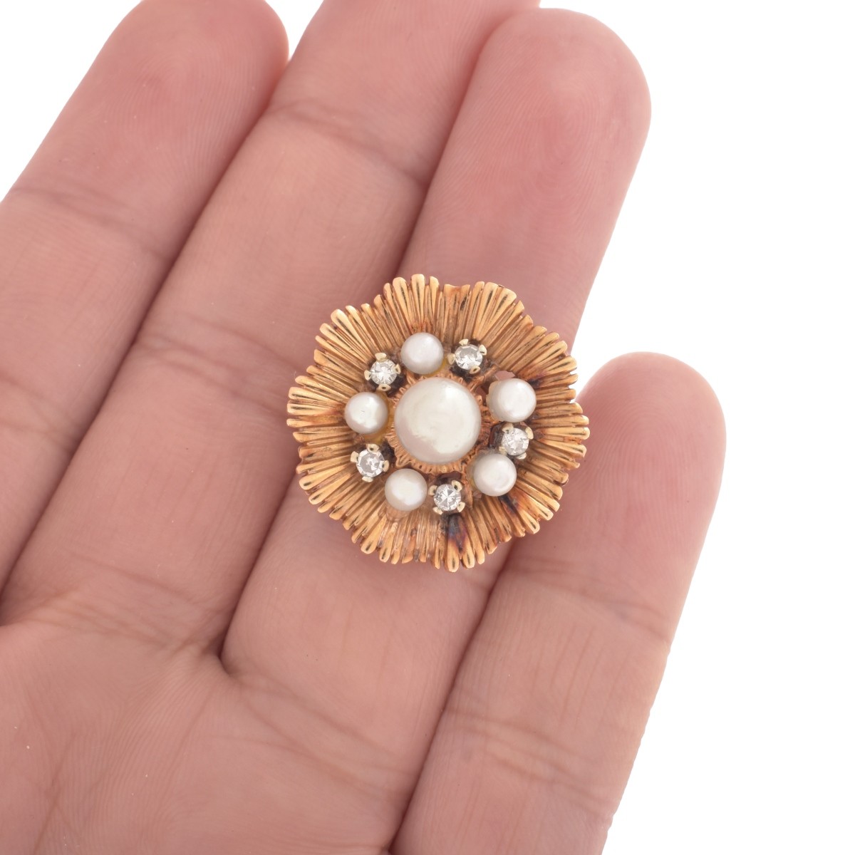 Vintage Five Small Round Cut Diamond, Pearl and 14 Karat Yellow Gold Ring. Largest pearl measures 7mm. Ring size 6. Approx. weight: 10.85 grams. Condition: Very good vintage condition. Needs cleaning. Estimate: $500.00 - $700.00 Domestic Shipping: $32.00