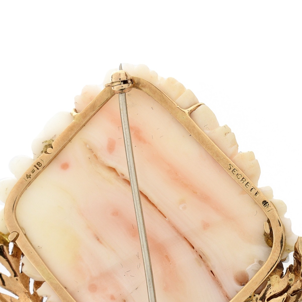 Vintage Carved Angel Skin Coral and 14 Karat Yellow Gold Flower Brooch Accented with Four Small Round Cut Diamonds. Measurers 2-1/4" H, 1-7/8" W. Approx. weight: 29.66 grams. Condition: Very good vintage condition. For additional information and/or WhatsApp video please contact our resident GIA Graduate Gemologist, Russ Kodner at 954.650.5030 Estimate: $400.00 - $600.00 Domestic Shipping: $40.00