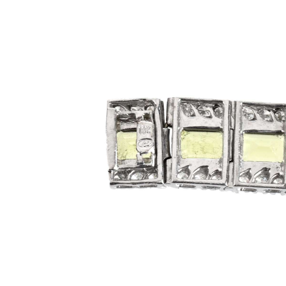 Approx. 7.05 Carat TW Round Brilliant Cut Diamond, 23.0 Carat TW Emerald Cut Peridot and 18 Karat White Gold Belt Buckle style Link Bracelet. Diamonds F-G color, VS1-VS2 clarity. Peridots with good color and clarity. Stamped 18K. Measures 7-1/8" L, 5/8" W. Approx. weight: 47.29 grams. Condition: Very good condition. For additional information and/or WhatsApp video please contact our resident GIA Graduate Gemologist, Russ Kodner at 954.650.5030 Estimate: $10,000.00 - $15,000.00 Domestic Shipping: $40.00