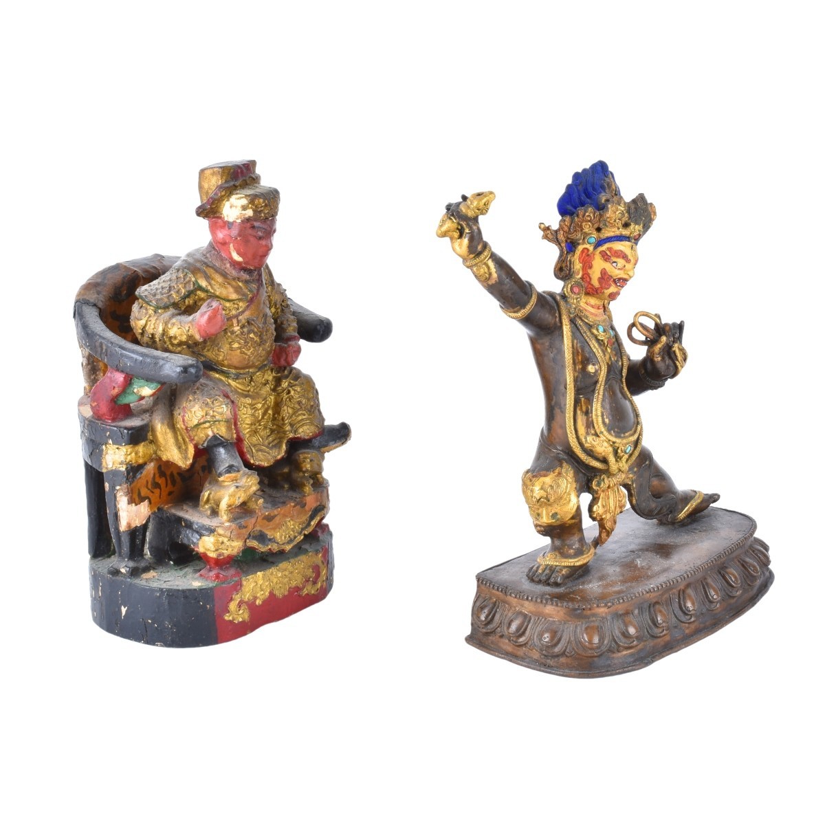 Two (2) Vintage Asian Figurines. A Chinese carved Emperor on Throne 7-3/4"; Thai decorated bronze dancer 7-1/2". Unsigned. Condition: Wear, losses. Typical age wear for a pre owned item. Estimate: $150.00 - $400.00 Domestic Shipping: $72.00