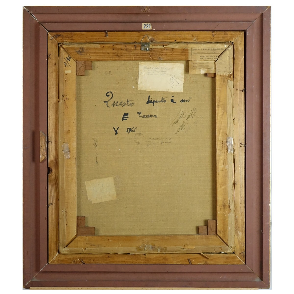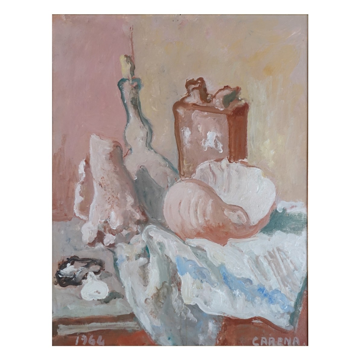 Felice Carena, Italian (1879 - 1966) Oil on Canvas "Natura Morta" (Still Life) Signed and Dated 1966. Gallery label and inscribed en verso. Measures 24" x 20", frame measures 32-3/4" x 28-3/4". Condition: Two tiny holes at the top center, appears to have a small spot that can be cleaned otherwise good condition. Estimate: $4000.00 - $6000.00 Domestic Shipping: $165.00