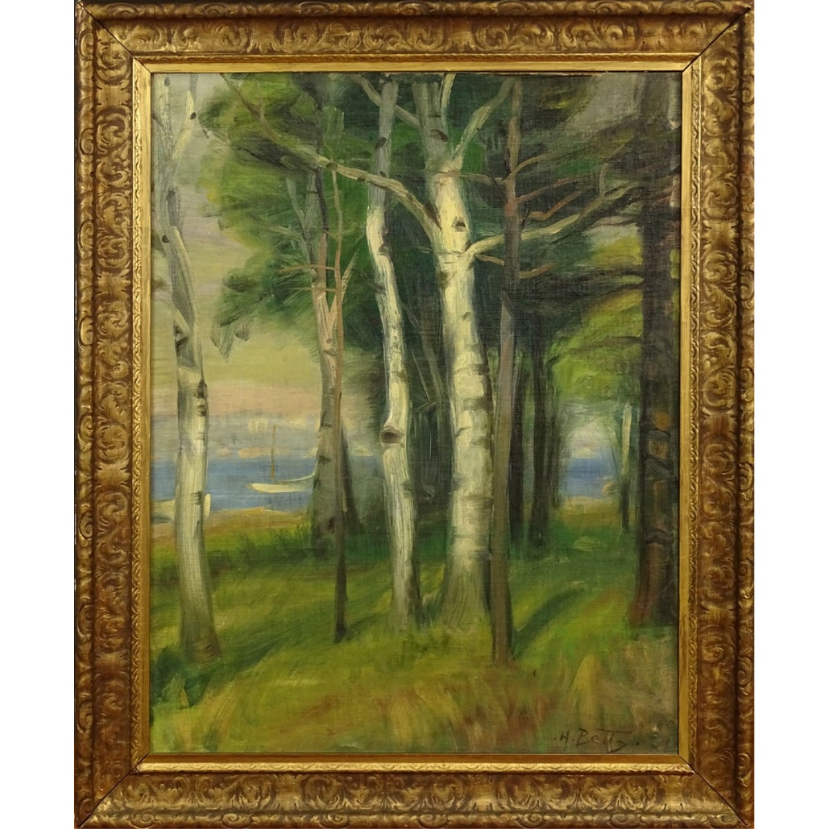 Harold Harrington Betts, American (1881 - 1951) Oil on Canvas laid down on Masonite. "Woodland Scene" Signed H. Betts Lower Right. Measures 28-1/2' X 22". Frame Measures 34-1/4' x 27-1/2". Condition: Good used Condition, canvas laid down on masonite lifting at top. Estimate: $400.00 - $800.00 Domestic Shipping: Third Party