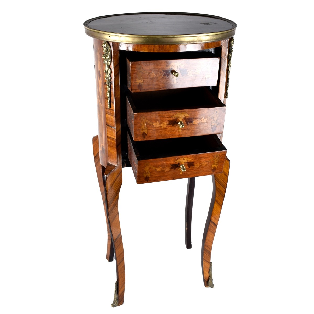 Early to Mid 20th Century Louis XVI Style Marquetry Inlaid Side Table with Bronze Mounts. Three sliding drawers. Measures 31-5/8" x 14". Condition: Restoration to one leg, some losses to the veneer otherwise good condition. Estimate: $200.00 - $300.00 Domestic Shipping: Third party