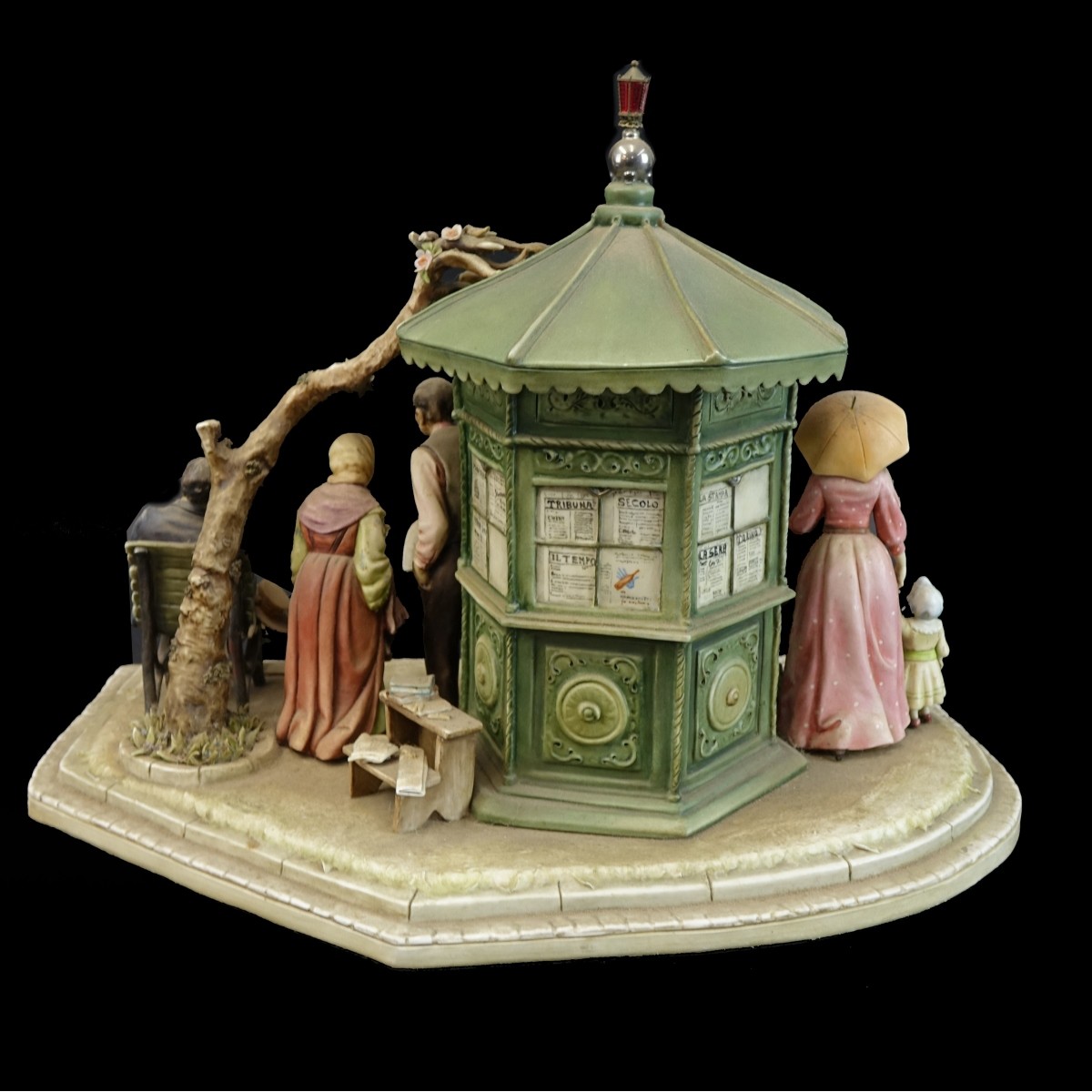 Antique Antonio Borsato "News Kiosk" Gres D'arte Italian Porcelain Group. Signed on bottom side. Measures 15" H x 17-3/4" W x 13-1/2" D. Condition: Needs cleaning, One or two pedals with chip otherwise good condition, but inspector may have missed some imperfections Estimate: $250.00 - $500.00 Domestic Shipping: Third party