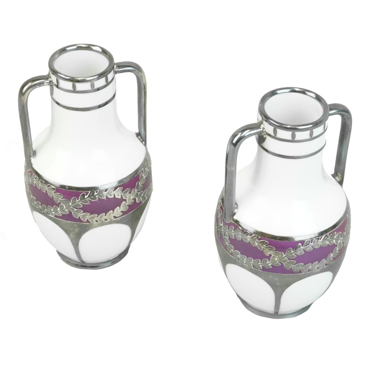 Pair of Rosenthal Silver Overlay White Ground Purple accent Porcelain Vases. Signed on the base. Measures 5" x 2-1/2". Condition: Good condition. Estimate: $40.00 - $80.00 Domestic Shipping: $48.00