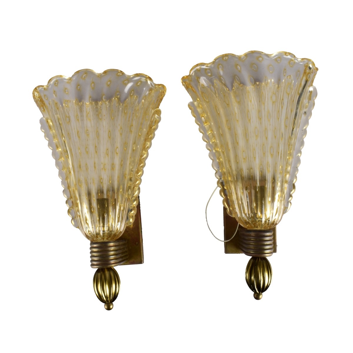 Pair of Italian Murano Art Deco Style Glass Sconces with Brass Hardware. Overall measures 16-1/8" x 9-3/4" x 7". Condition: Both sconces are in good condition. Hardware has some oxidation. Estimate: $600.00 - $800.00 Domestic Shipping: Third party