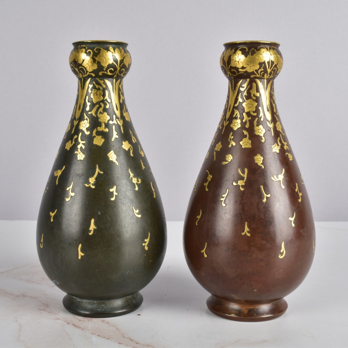 Pair of Fine Antique Christofle Art Nouveau Bronze and Brass Inlaid Vases. Signed and numbered 204 on the base. Measures 5-1/4" x 2-5/8". Condition: Good condition. Estimate: $500.00 - $800.00 Domestic Shipping: $55.00