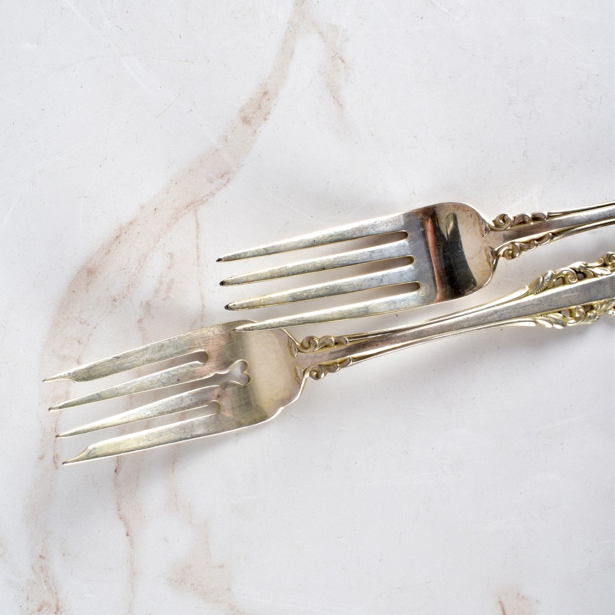 Sixty Eight (68) Piece Gorham "Medici" Sterling Silver Flatware. Includes: (4) dinner knives measuring 9-1/8", (16) forks measuring 7-1/2", (16) salad forks measuring 6-3/4", (16) spoons, and (16) butter spreaders. Stamped. Approx. weight: 156.86 troy ounces (w/ hollowware). Approx. weight: 123.30 (w/o hollowware). Box is for display purpose only. Condition: Good condition. Estimate: $2000.00 - $3000.00 Domestic Shipping: $88.00