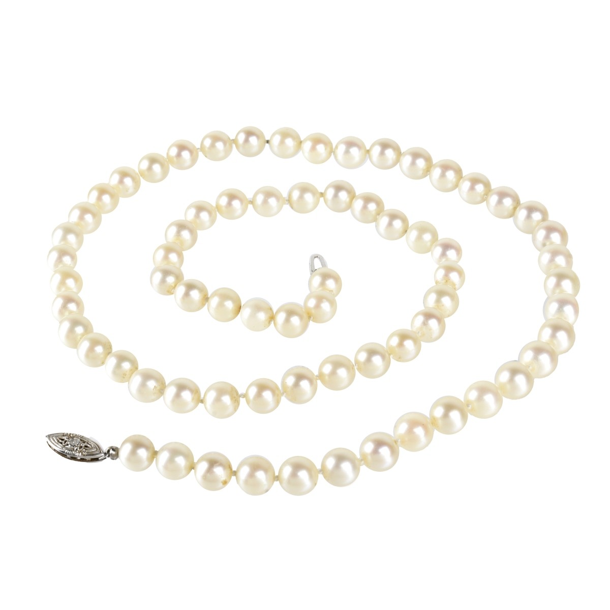 Vintage Single Strand 7.8-8.0mm Pearl Necklace with 14 Karat White Gold Clasp. Stamped 14K to clasp. Measures 23-1/2" L. Approx. weight: 46.02 grams. Condition: Very good vintage condition. Estimate: $200.00 - $400.00 Domestic Shipping: $40.00