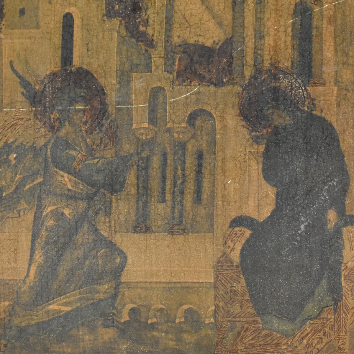 Two (2) Hand Painted Icons. Mother Mary and Child, three shields with writing,on rounded wood panel. unsigned Measures12-3/4" H x 8-1/4" W. The Savior by Andre Rublev print on wood board, tag inverso. measures 14-3/4" H x 11-1/2" W. Condition: The Savior needs a cleaning, flaking of gesso, scratches. Mary needs a cleaning some light losses. Estimate: $100.00 - $300.00 Domestic Shipping: $85.00