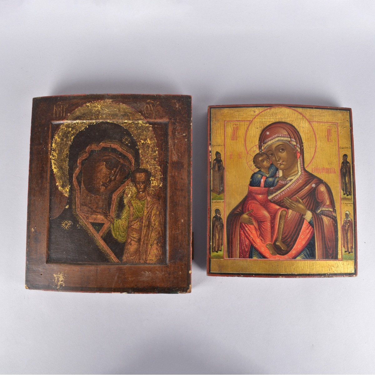 Two (2) Russian Religious Icons, wood panels of a Feodorouskaya, Mother Mary, child and four holy people, along with Our Lady of Kazan on wood panel. Largest measures 12-1/4" H x 10-1/2" W Condition: Both have paint loss, flaking some light scratching, corner bumps otherwise good condition. Estimate: $100.00 - $300.00 Domestic Shipping: $85.00