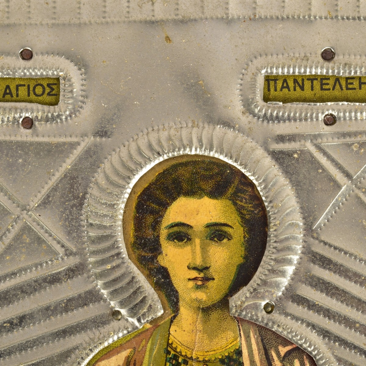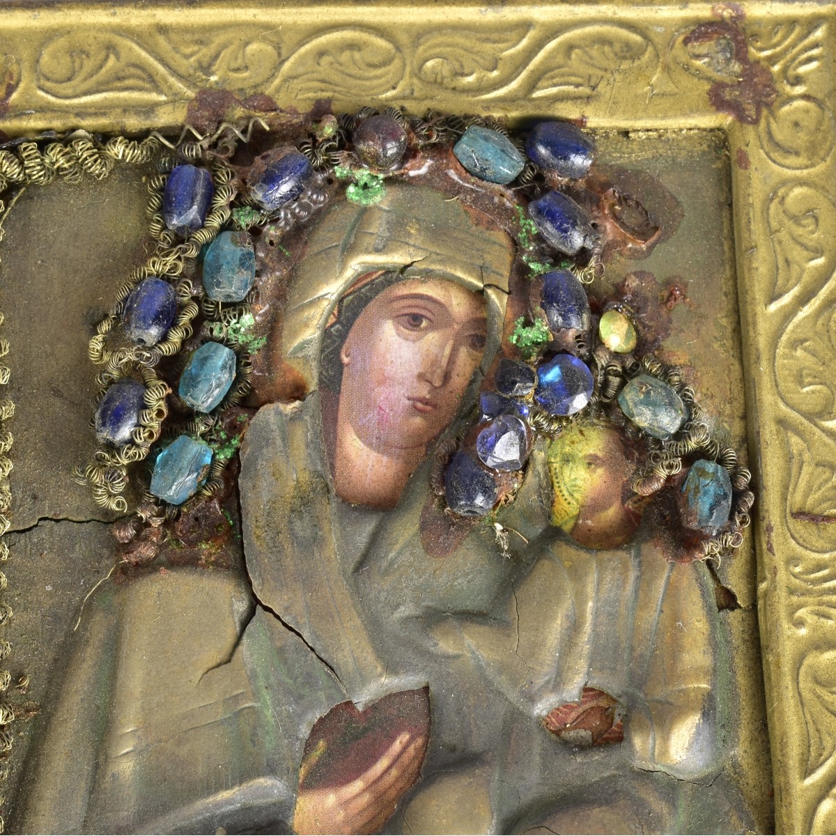 Four (4) Russian Religious Icons mounted in metal on wood. Smallest Mother of God overlay marked A. M. over1859, B. W., 84 silver mark, St. Petersburg city mark.,under has Mother and cyrillic writing. Next Mother Mary with brass overlay, unsigned with beads, not hand painted paper faces. St. Pantaleon is covered in white metal and iron frame. Virgin and child, unsigned, white metal and brass, not handpainted poster faces. Largest measures 11-1/4" H x 9-1/4" W. Condition: Silver 8s some bumps, crown loose and not nailed down. Virgin frame gesso is breaking up. Estimate: $100.00 - $300.00 Domestic Shipping: $72.00