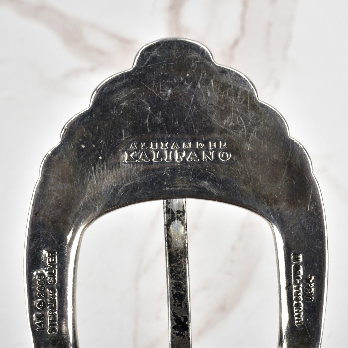 J.W. Cooper Leather Belt with Kalifano 14kt and Sterling Silver Belt Buckle. Stamped approperately. Makers mark, 2005, 14kt., Sterling silver and handmade. Belt branded J. W. Cooper. Measures 45" long. overall 48". Condition: Good Condition Estimate: $200.00 - $400.00 Domestic Shipping: $42.00