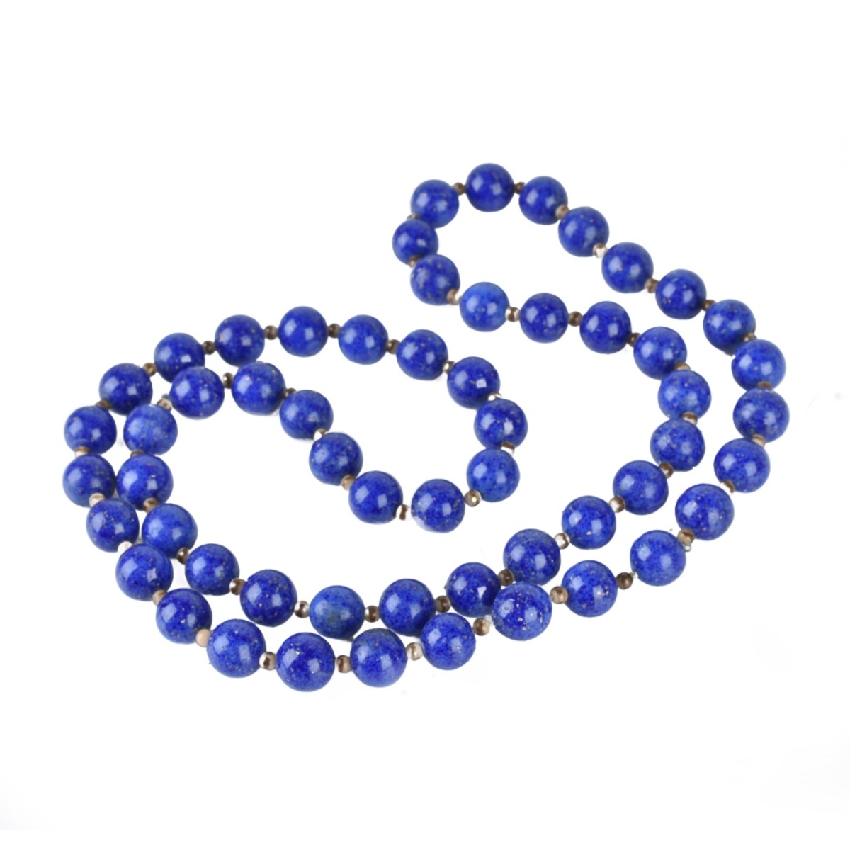 Vintage 10mm Lapis Lazuli Bead Necklace. Measures 27" L Approx weight: 97.29 grams. Condition: Good vintage condition. Estimate: $100.00 - $200.00 Domestic Shipping: $40.00