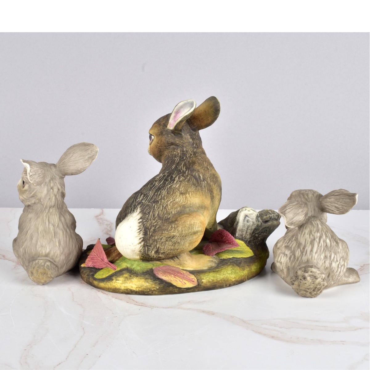Grouping of Three Vintage Boehm Porcelain Rabbit Figurines. Marked on the bases. Tallest measures 6-1/4" x 7-1/8". Smallest measures 3-1/4" x 3-1/8". Condition: All in good condition. Estimate: $50.00 - $150.00 Domestic Shipping: $78.00