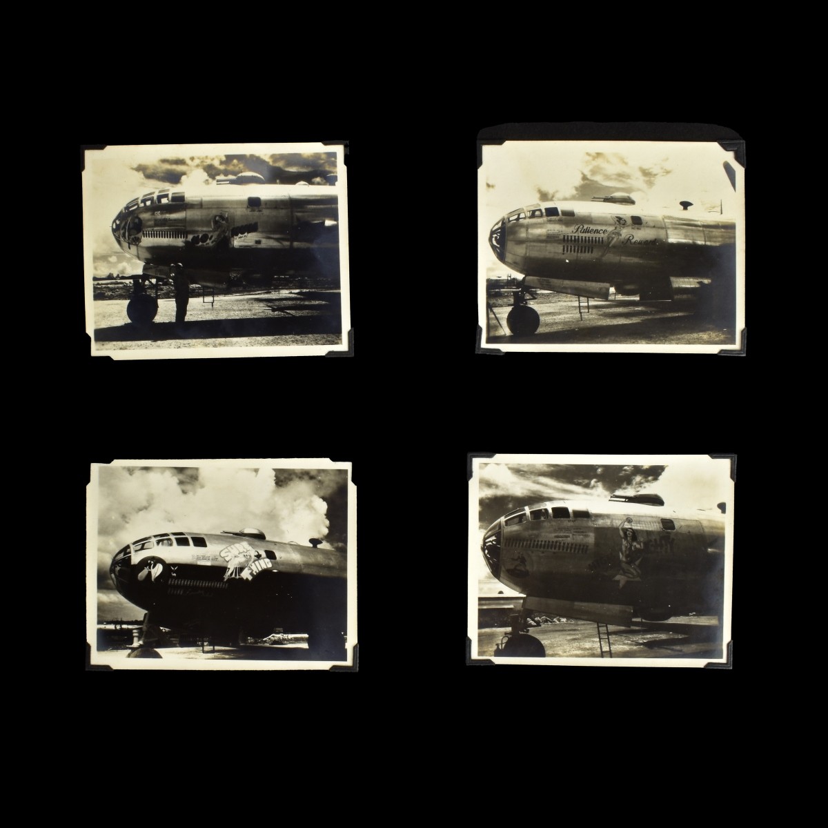World War II (2) Tinian, Guam, Vintage Rare Photo Album. Approx. 130 original photos, mostly of Tinian. Comic map of Island by Sgt. Bill Goggins. International News photos and associated press photos of Dreamboat Bomber, and personal photo's of Patience and Sure Thing. Photos in flight of the planes from the bombers of the ground, some explosions. Photos of the Bomber wing people in their huts, on bicycles playing with dogs. 24 tourist cards with caption from 1945. Surrender photos on ships of Japanese and Americans. Letters from the 314th bomber squadron, photo USS Marine Panther coming home. Cpl. Edward G. Hofgren thanking him for his service. Measures 11-1/2 H x 15-1/2 W x1-1/4" Condition: Good used condition, album has some foxing but photos look good some yellowing, folded corners, etc. Estimate: $200.00 - $400.00 Domestic Shipping: $75.00