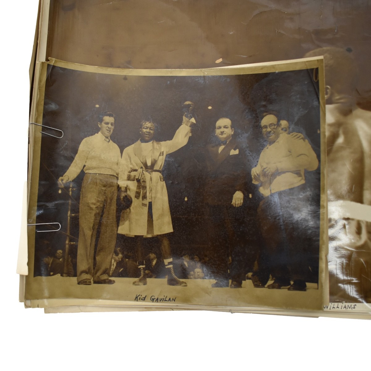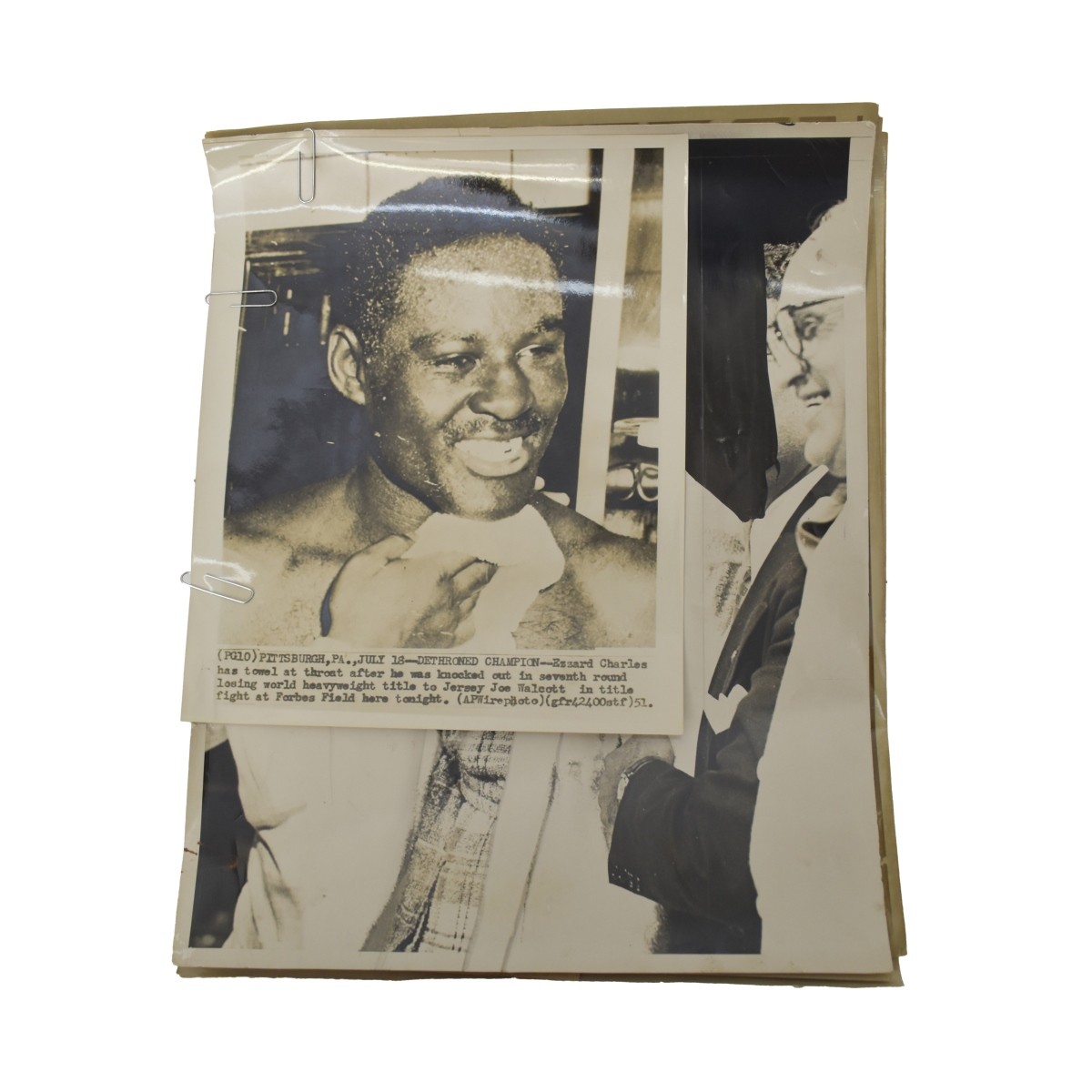 Twenty Seven (27) Boxing Matches 1949 Press Photos, mostly International News Press Photos,12.28 Kid Gavilan, Ike Williams, 5.13 Fusari, Foster, 6.22, Essard Charles 7.18 Ezzard Charles, Jersey Joe Walcott, 10.28 Paddy Demarco, Sandy Saddler, 11.11 Terry Young, Charlie Fusari, 12.16 Tuzo Portugues, Beau Jack. and many referees. Some accompanied with caption slips, newspaper clippings or writing to back. photos measure 11" x 14",10" x 8" and9-1/4" x 4". Condition: Some are faded, some have rips and creases and have been retouch, some unmarked, Good used condition. Estimate: $100.00 - $300.00 Domestic Shipping: $58.00