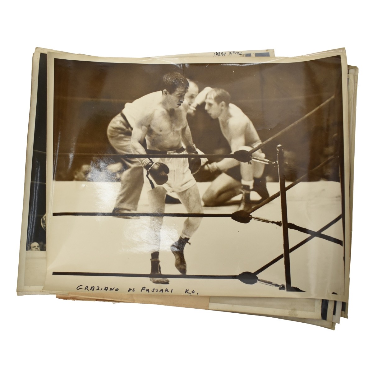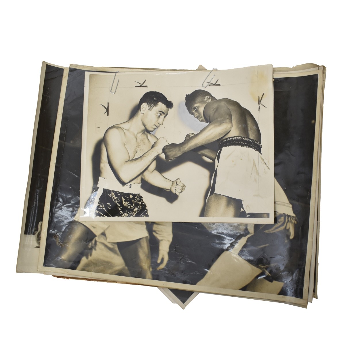Twenty Four (24) Boxing Matches 1950 Press Photos. mostly International News Press, some Associated press. Joe Maxim publicity photo. 2.7, Costner, Burton. 2.17/2pcs, Sonny Boy Williams, Joe Williams. 3.17, Ray FAmechon, Willie Pep. 3/21/3pcs. Gil Turner, Don Williams. 3.23 Ezzard Charles, Freddy Behore. 3.22/2pcs Sugar Ray Robinson, George Costner. 3.31Tony Janiro, Rocky Graziano. 3.24, Rocky Marciano, Roland LaStarza 5.19 Dick Wagner, Tiverio Matri. 9.23, Graziano, Fussari. 9.22 Sugar Ray, Randy Turpin. 922., Johnny Saxon, Tony Pellone, and many referees. Some accompanied with caption slips, newspaper clippings or writing to back. photos measure 12-11" x 14", 7-10" x 8" and 5-9-1/4" x 4". Condition: Some are faded, some have rips and creases and have been retouch, Good used condition. Estimate: $100.00 - $300.00 Domestic Shipping: $58.00