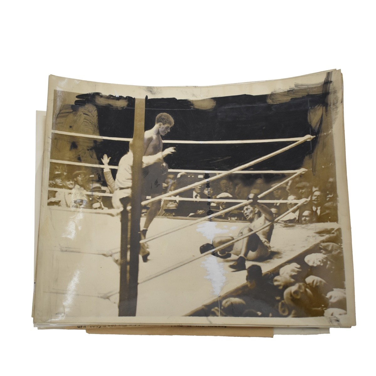 Nine (9) Marciano & Dempsey Boxing Photos. 1949 thru 1953 many referees. Some accompanied with caption slips, or writing to back. photos measure , 7-10" x 8" and 9-1/4" x 4". . Condition: Some are faded, some have rips and creases and have been retouch, Good used condition. Estimate: $100.00 - $300.00 Domestic Shipping: $48.00