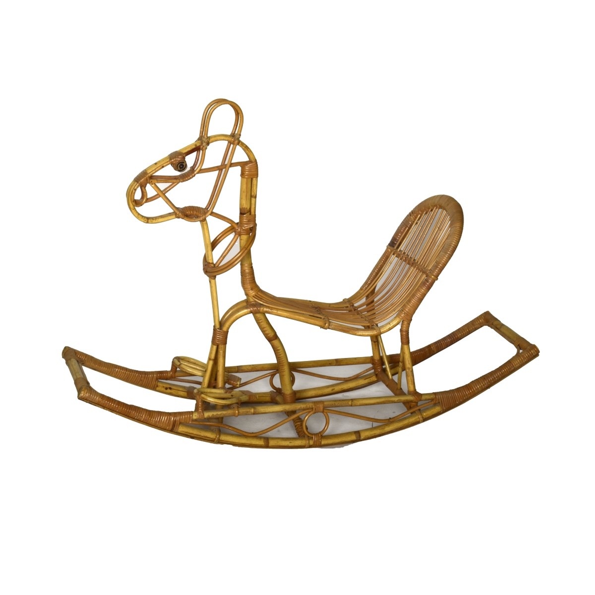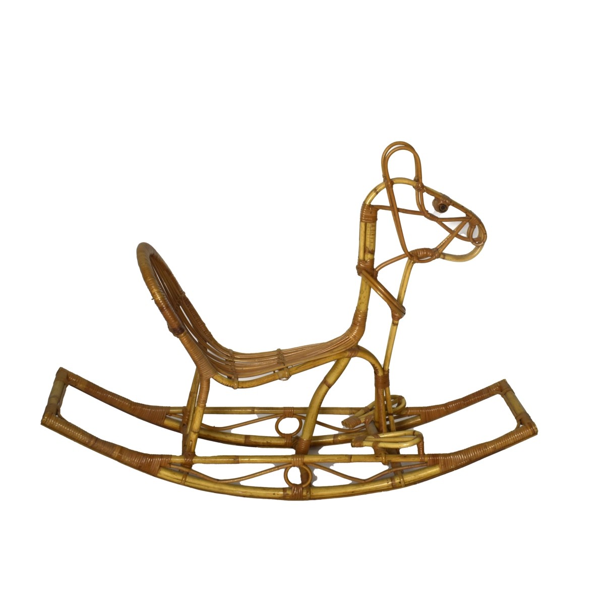 Franco Albini (Italian 1905-1977) Rattan Rocking Horse Sculpture. Unsigned. Measures 34-3/4"H x 48"L x 12-1/4"W Condition: Good Condition typical wear for a pre owned item. Some loose Rattan Reed, some of the Cane is stained. Estimate: $50.00 - $150.00 Domestic Shipping: Third Party