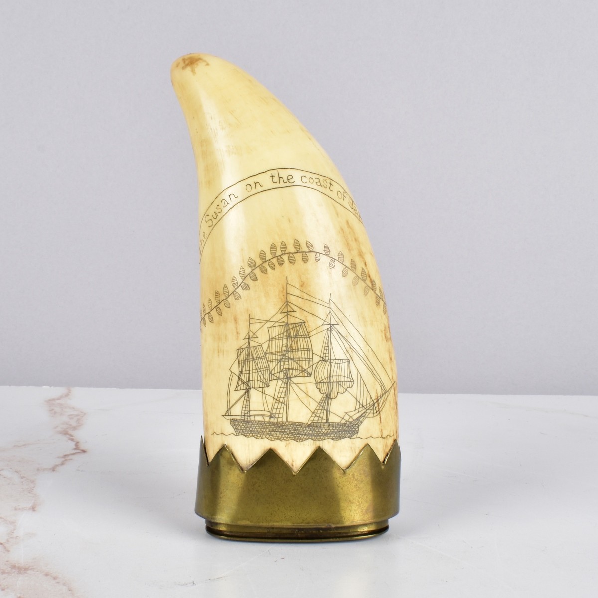 Antique Nautical Etched Scrimshaw Whales Tooth with Brass Mount. Measures 5-1/4" x 2-1/4". We Will Not Ship This Item Out of State of Florida. Anyone Having This Item Shipped Must Have a Florida Address or the Item will not be Shipped. We will Not Knowingly Sell Endangered Species outside of Legal Channels. Condition: Good condition. Estimate: $300.00 - $400.00 Domestic Shipping: $55.00
