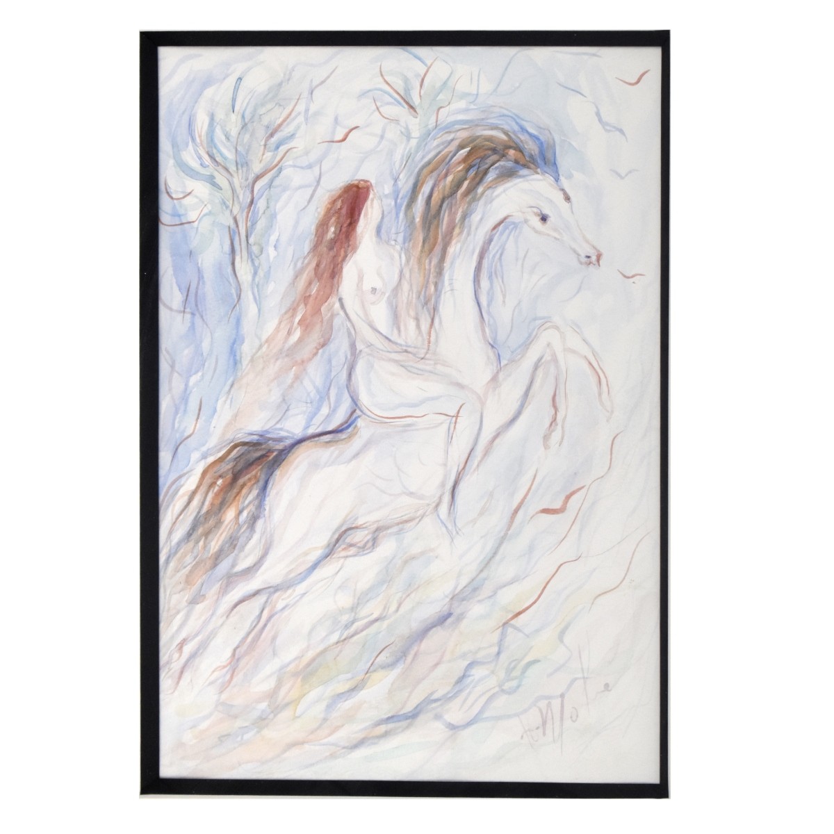 Hector Molne, Cuban (Born 1935) Watercolor on Paper "Nude on Horseback" Signed Lower Right. Documentation to accompany the lot. Measures 11" x 8-1/4". Frame measures 20-1/2" x 17-3/8" x 2". Condition: Good condition. Estimate: $400.00 - $600.00 Domestic Shipping: $145.00
