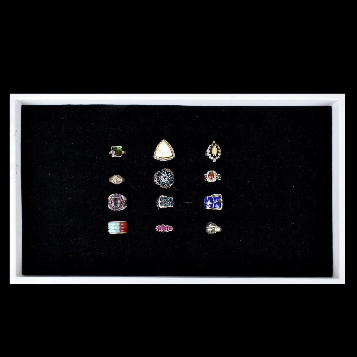 Collection of Twelve Fashion Jewelry Sterling Silver Rings. Variously accented with faux gemstones, faux diamonds, hardstones and more. Various sizes. Most stamped 925. Approx. total weight: 78.91 grams. Condition: Good vintage condition. Some may need polishing. Estimate: $50.00 - $150.00 Domestic Shipping: $40.00