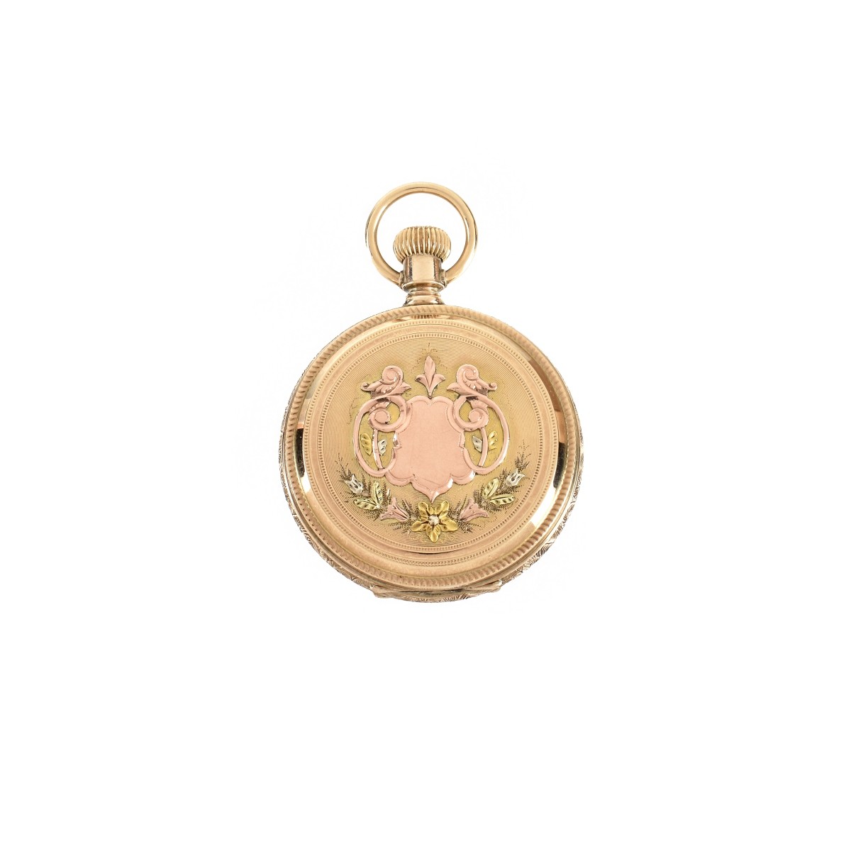 Lady's Antique Elgin Tri-color 14 Karat Gold Pocket Watch. Manual wind movement. Case measures 43mm. Elegant raised relief urn with flowers accented with rose cut diamonds to verso and shield to obverse. Engraved Lucy Faringer to case interior. Stamped 14K to case interior. Approx. gross weight: 72.49 grams. Condition: Very good antique condition. Running. Please note the gallery does not warranty the running condition of watches. For additional information and/or WhatsApp video please contact our resident GIA Graduate Gemologist, Russ Kodner at 954.650.5030 Estimate: $1500.00 - $2500.00 Domestic Shipping: $40.00