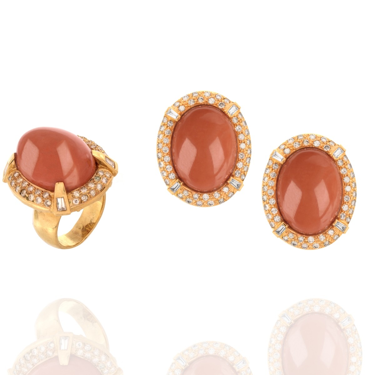 Vintage Red Coral, Pave Set Round Brilliant Cut Diamond, Baguette Cut Diamond and 14 Karat Yellow Gold Ring and Clip Back Earrings Suite. Diamonds G-H, VS1-VS2 clarity. Stamped 585, 14K. Ring size 5-1/2. Earrings measure 1-1/16" L, 7/8" W. Approx. total weight: 24.1 dwt. Condition: Very good vintage condition. For additional information and/or WhatsApp video please contact our resident GIA Graduate Gemologist, Russ Kodner at 954.650.5030 Estimate: $2500.00 - $3000.00 Domestic Shipping: $40.00