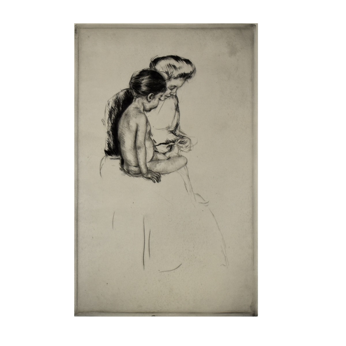 Mary Cassatt, French (1844 - 1926) Drypoint Etching on Laid Paper "Pedicure" Unsigned. A. Porcabeuf watermark on the paper. Unframed. Sheet measures 23-1/2" x 17-1/8". Condition: Minor toning and wrinkles to the paper. Estimate: $300.00 - $500.00 Domestic Shipping: $72.00