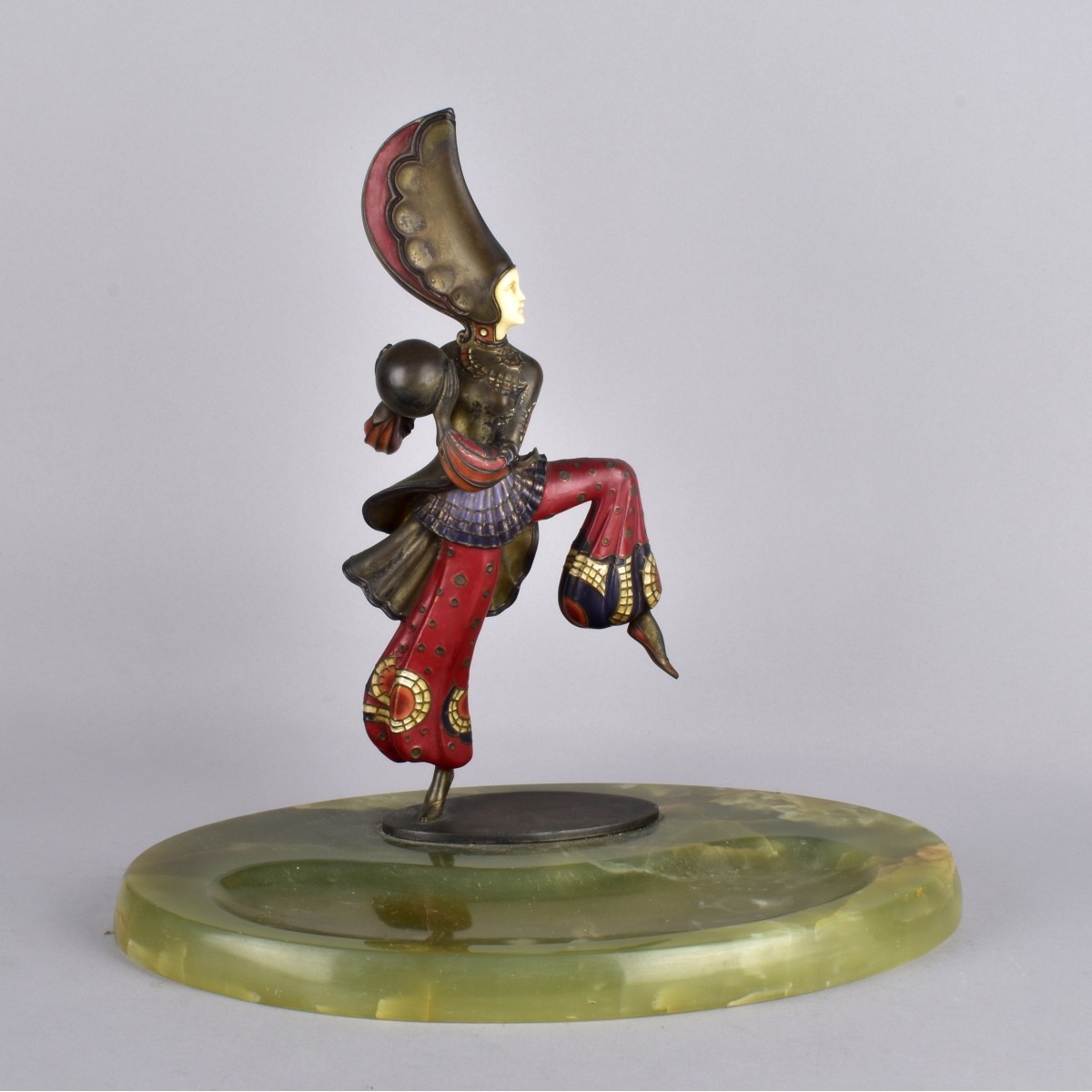 Gerda Gerdago, Austrian (1906 - 2004) "Carnival" Cold Painted Bronze Sculpture with Mask Face Presented on a Onyx Base. Signed and marked Austria. Overall measures 14-1/4" x 14-3/4" x 9-1/4". We Will Not Ship This Item Out of State of Florida. Anyone Having This Item Shipped Must Have a Florida Address or the Item will not be Shipped. We will Not Knowingly Sell Endangered Species outside of Legal Channels. Condition: Rubbing to the bronze surface. Stress lines to the face. Estimate: $6000.00 - $8000.00 Domestic Shipping: Third party