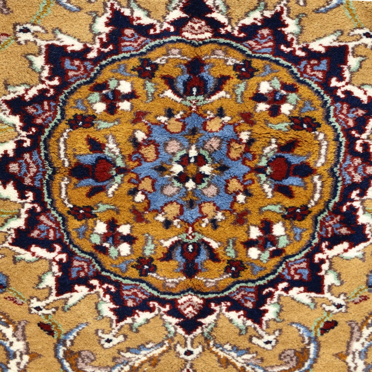 Semi Antique Indo Isfahan Wool Rug. Centralized medallion encircled by a floral border on multi color ground. Measures 72-1/4" x 52-1/4". Condition: Good condition. Estimate: $300.00 - $400.00 Domestic Shipping: $85.00