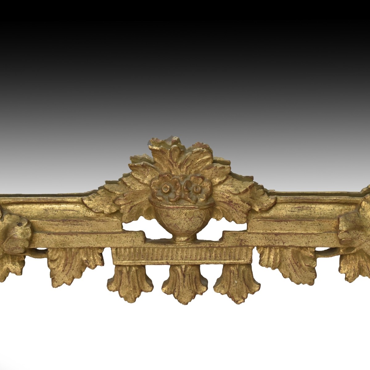Large Italian Louis XVI Style Giltwood Carved Mirror. Measures 37-1/8" x 22-1/2". Overall measures 56-1/2" x 30-1/2". Condition: Rubbing and some spotting to the frame. Estimate: $200.00 - $500.00 Domestic Shipping: Third party
