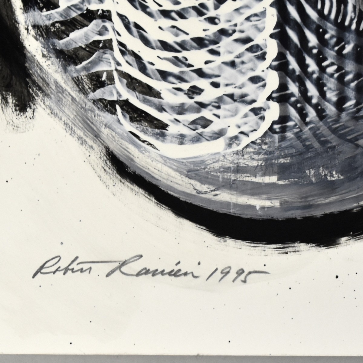 Robert Ranieri, American (Born 1930) Oil on Paper "Black and White Abstract Composition" Signed and Dated 1995 Lower Left. Unframed. Measures 23-7/8" x 35-3/4". Please note, this lot will be rolled in a shipping tube. Condition: Good condition. Estimate: $50.00 - $150.00 Domestic Shipping: $45.00