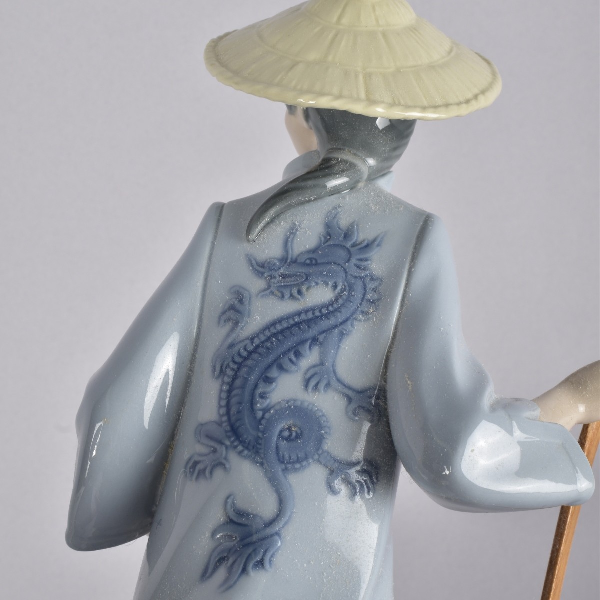 Lladro Rickshaw Ride Porcelain Figuring, blue mark to bottom #1383. Measures 12" H x 14-1/2" L x 8-1/2". Condition: Good condition, Rickshaw oriental persons left hand wooden rail is repaired. No Box. Estimate: $200.00 - $400.00 Domestic Shipping: Third Party