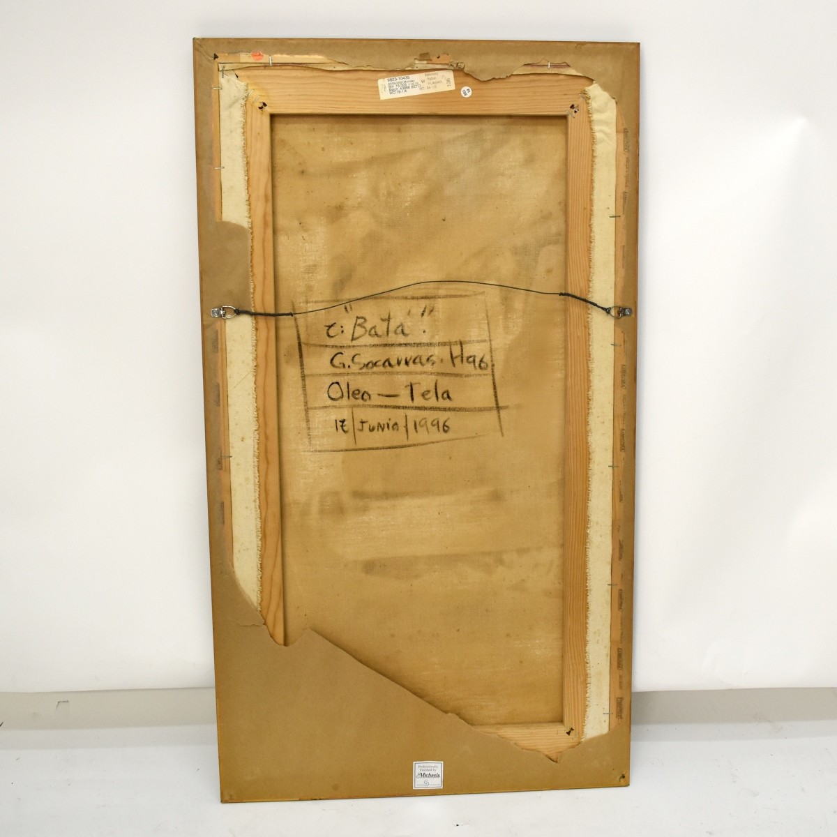 Guillermo Socarras Hernandez, Cuban (Born 1961) Oil on Canvas "Bata" Signed Lower Right. Inscribed en verso. Measures 34-1/4" x 18-1/4". Frame measures 36-7/8" x 20-5/8". Condition: Good condition. Estimate: $100.00 - $300.00 Domestic Shipping: Third party
