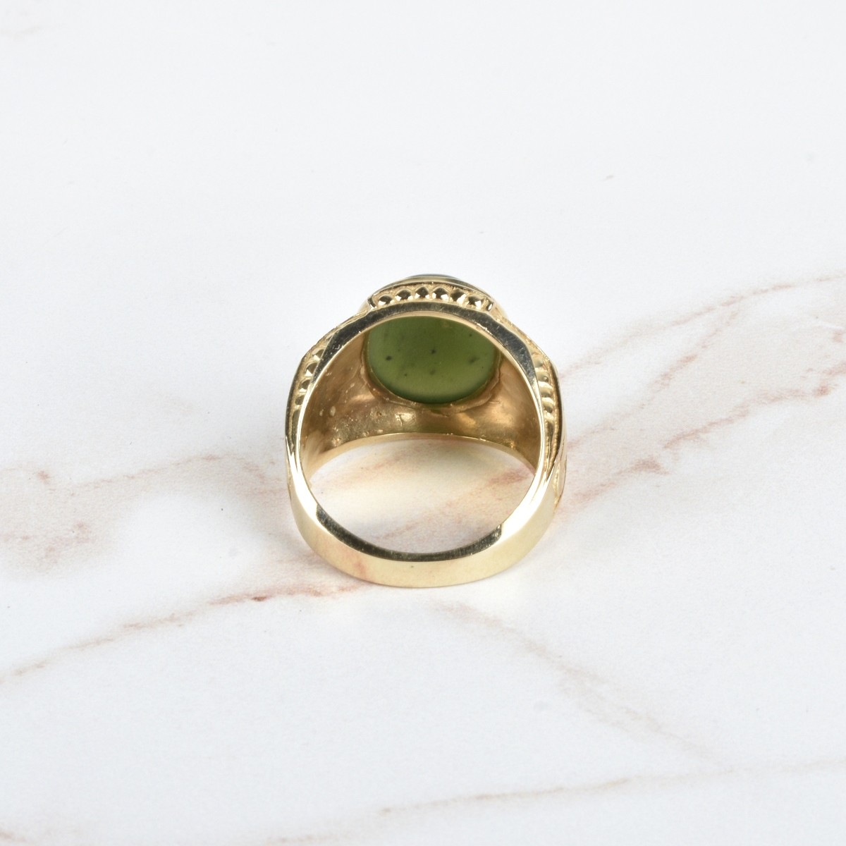 Man's Vintage Nephrite Jade and 14 Karat Yellow Gold Ring. Stamped 14K. Ring size 9. Approx. weight: 11.11 grams. Condition: Very good condition. For additional information and/or WhatsApp video please contact our resident GIA Graduate Gemologist, Russ Kodner at 954.650.5030 Estimate: $800.00 - $1200.00 Domestic Shipping: $40.00