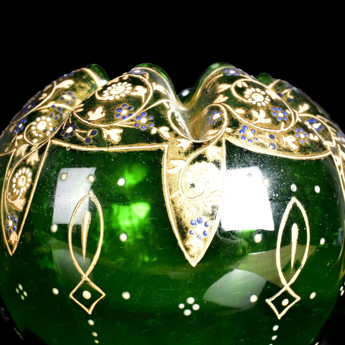 2-Piece Glass Tableware to Include: Art Nouveau style Cut Glass and Brass Mounted Centerpiece together with a Bohemian Hand Painted Green Art Glass Footed Vase. Both items are unmarked. Centerpiece measures 7-1/4" x 10". Footed vase measures 7-41/4" x 5-3/4". Condition: Both items are in good condition. Estimate: $50.00 - $150.00 Domestic Shipping: Third party