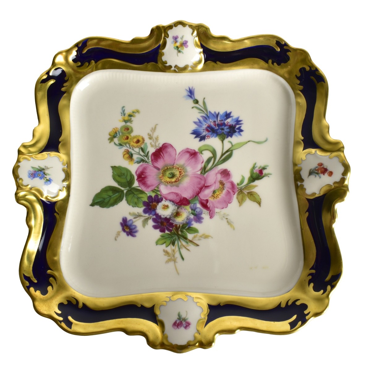 Grouping of Four Vintage Lindner Bavarian Porcelain Square Shape Plates. Each marked on the base. Larger measures 13" x 13". Smaller plates measure 8-5/8" x 8-5/8". Condition: All in good condition. Estimate: $50.00 - $150.00 Domestic Shipping: $72.00