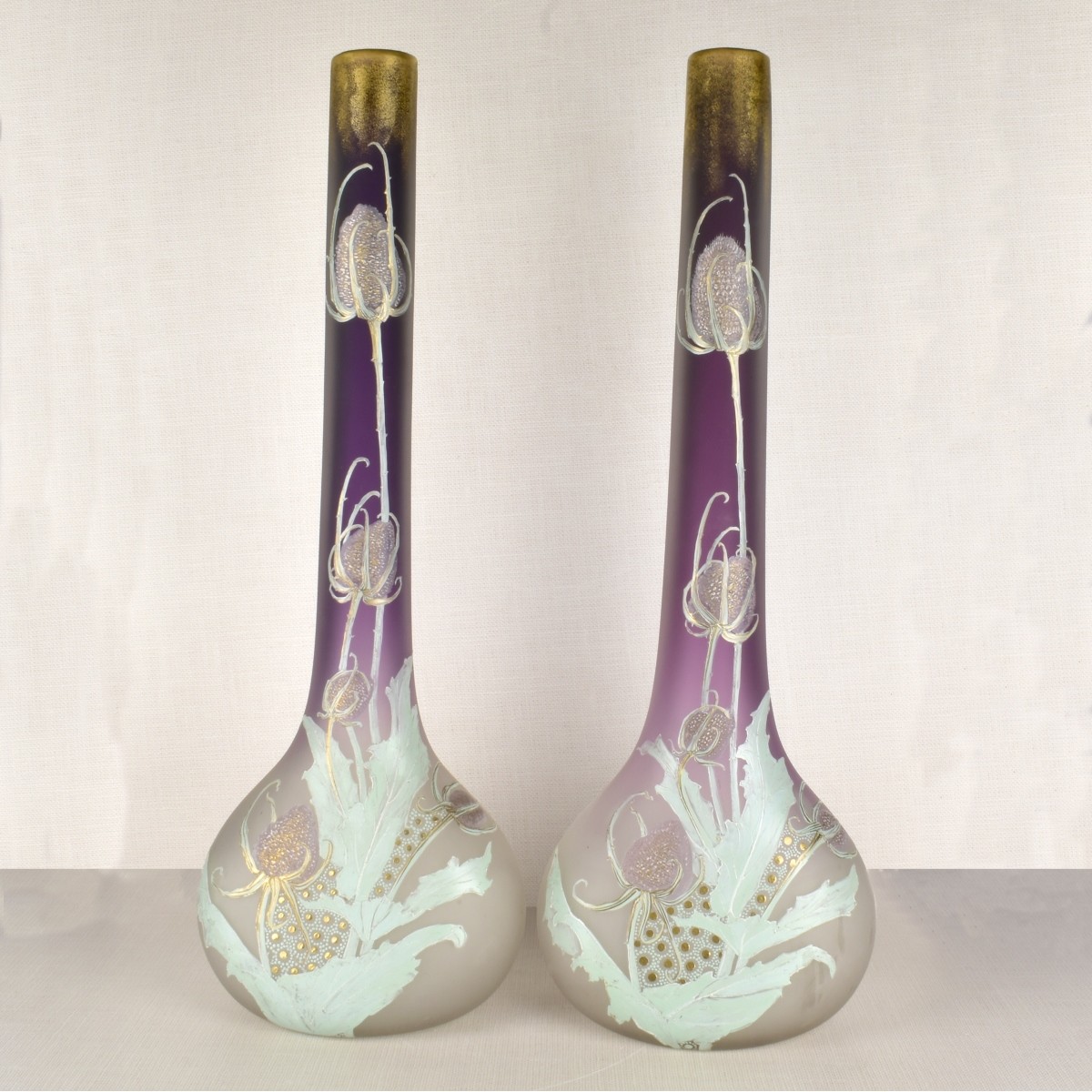 Large Pair of Antique Art Nouveau Legras Mont Joye Polychrome Enameled and Parcel Gilt Frosted Clear to Aubergine Glass Thistle Vases. Measure 27-1/4 H, 9" W. Condition: Very good antique condition. Estimate: $1500.00 - $2500.00 Domestic Shipping: Third party