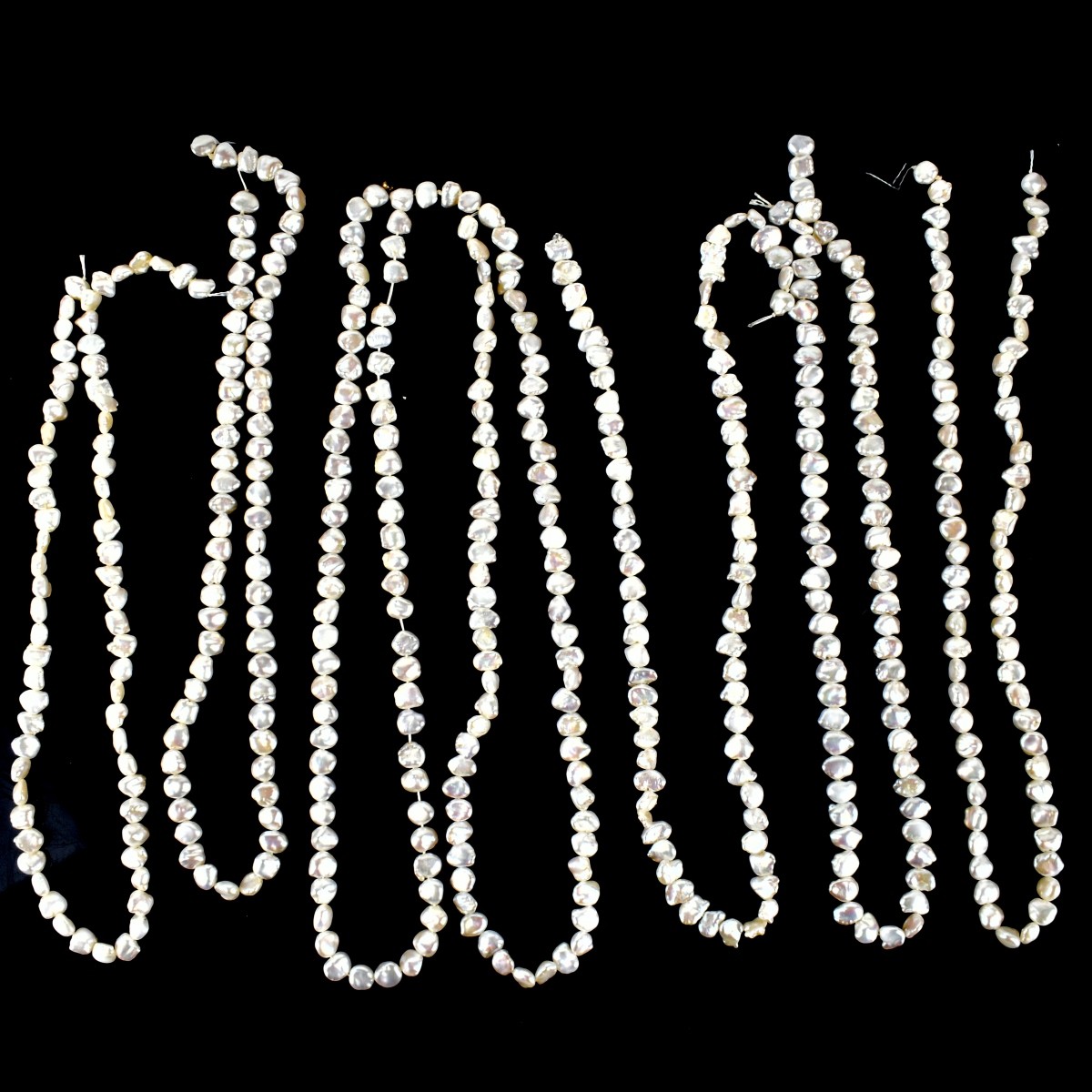 Seven Vintage Baroque Pearl Necklaces. Pearls measure 6.0-7.0mm. No clasps. Necklace measure 16-1/2" L. Condition: Good vintage condition. No clasps. Estimate: $100.00 - $300.00 Domestic Shipping: $40.00