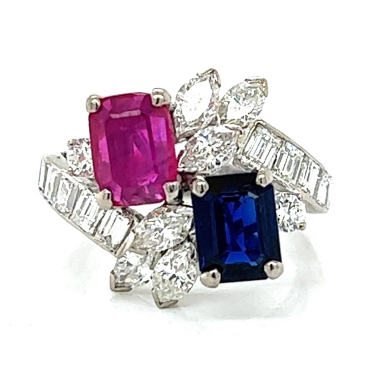 Vintage Approx. 1.50 Carat Emerald Cut Ruby, 1.50 Carat Emerald Cut Sapphire, 2.50 Carat TW Twenty Marquise, baguette and Round Brilliant Cut Diamonds and 14 Karat White Gold Ring. Ruby and sapphire with good color and clarity. Diamonds F-H color, VVS-VS clarity. Ring size 6. Approx. weight: 6 grams. Condition: Very good condition. For additional information and/or WhatsApp video please contact our resident GIA Graduate Gemologist, Russ Kodner at 954.650.5030 Estimate: $8000.00 - $12,000.00 Domestic Shipping: $40.00
