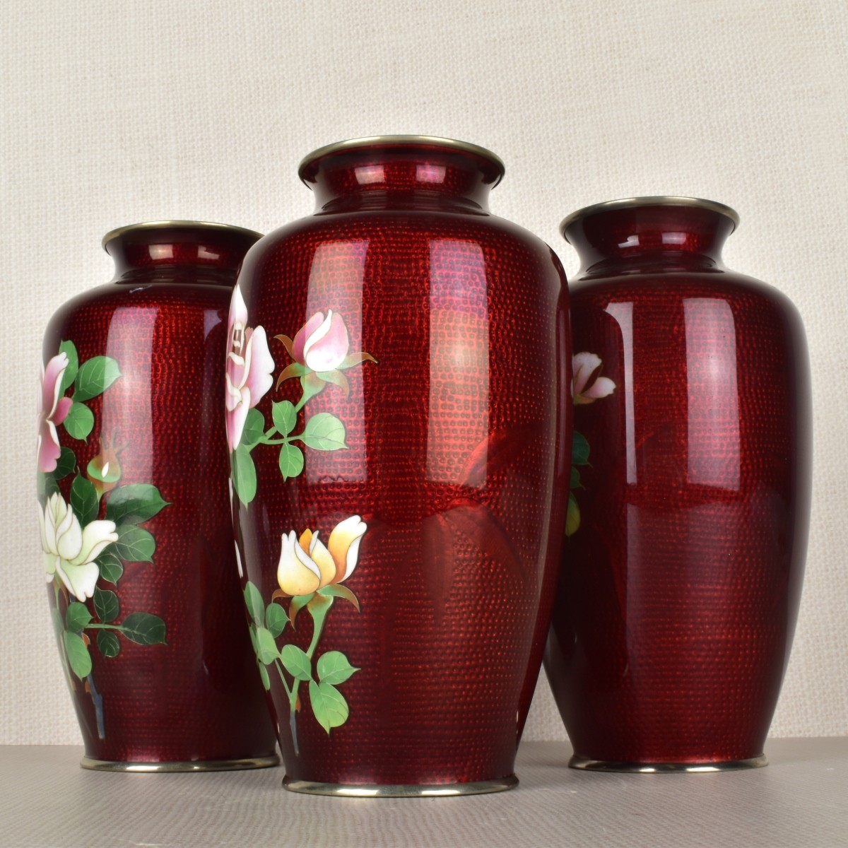 Three (3) Japanese Cloisonne Pigeon Blood Red Ginbari Foil Vases Decorated with Large Roses. Mid 20th century. Measures: 7-1/16" H, 4" D. Condition: Good condition. Estimate: $200.00 - $300.00 Domestic Shipping: $88.00