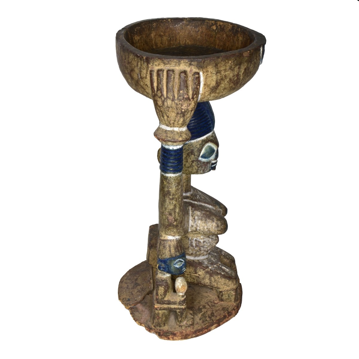 African (Yorouba Culture) Polychrome Hand Carved Wood Ceremonial Altar Figural Sculpture of Obatala. Michael Wyman Gallery purchase receipt for $6,700.00. Measures 37-1/2" x 19". Condition: Seam splits to the surface, rubbing to the paint. Estimate: $3000.00 - $6000.00 Domestic Shipping: Third party