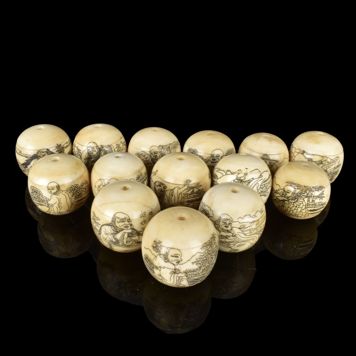 Fourteen (14) Chinese Prayer Beads with Immortals and Chinese writing on each bead. Each measure approximately 28mm. We Will Not Ship This Item Out of State of Florida. Anyone Having This Item Shipped Must Have a Florida Address or the Item will not be Shipped. We will Not Knowingly Sell Endangered Species outside of Legal Channels. Condition: Good condition, unstrung some yellowing. Estimate: $50.00 - $150.00 Domestic Shipping: $45.00 Florida only