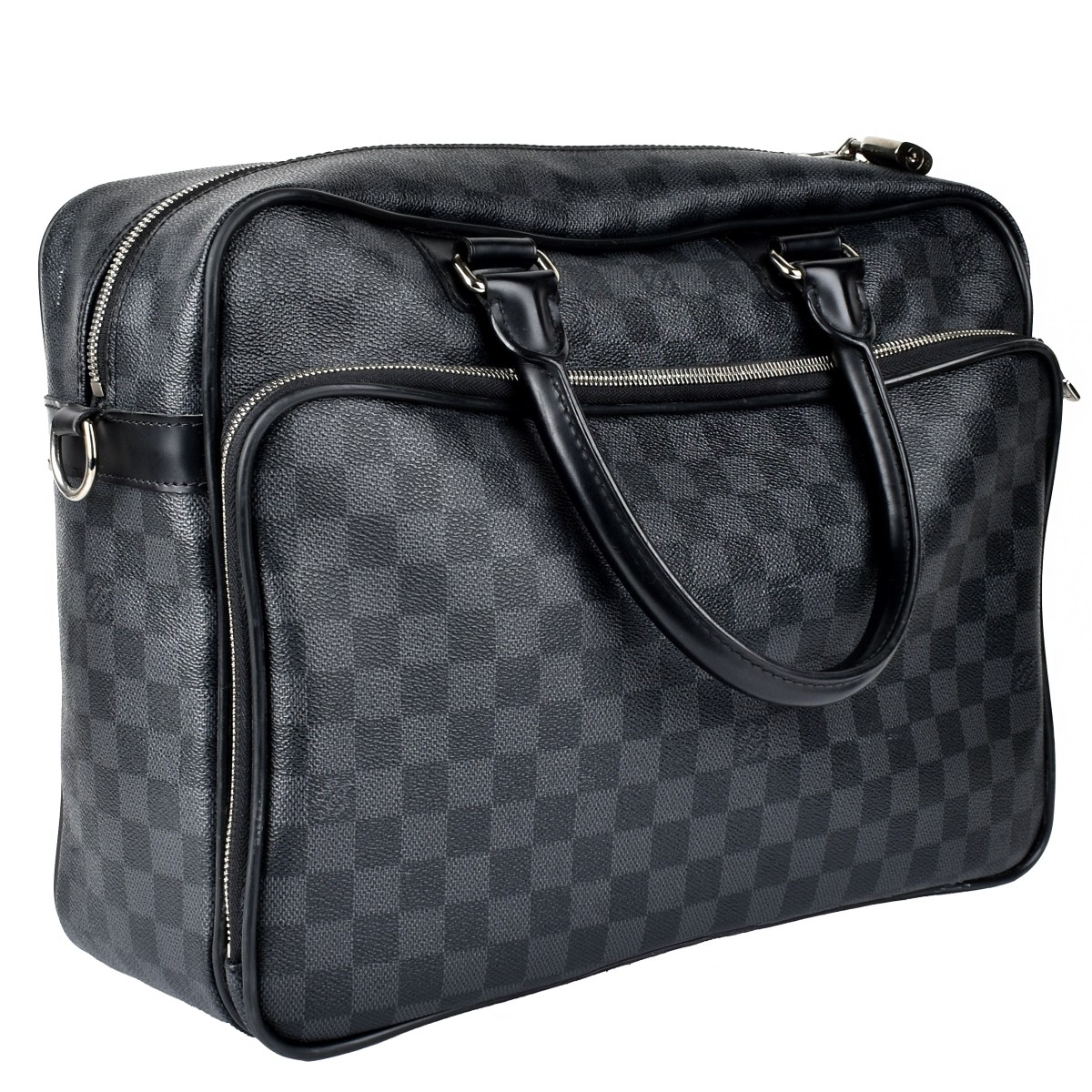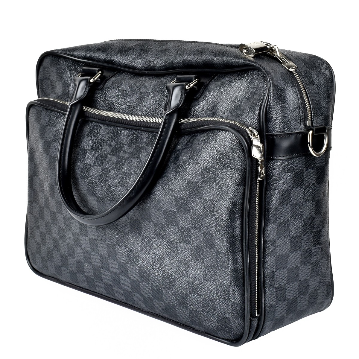 Louis Vuitton Icare Damier Graphite / Black Coated Canvas Laptop Bag. Black fabric interior, silver hardware. Measures 15" W, 11" H, 6" D. Complete with shoulder strap, lock & keys. Condition: Good gently used condition Estimate: $1000.00 - $1500.00 Domestic Shipping: $85.00